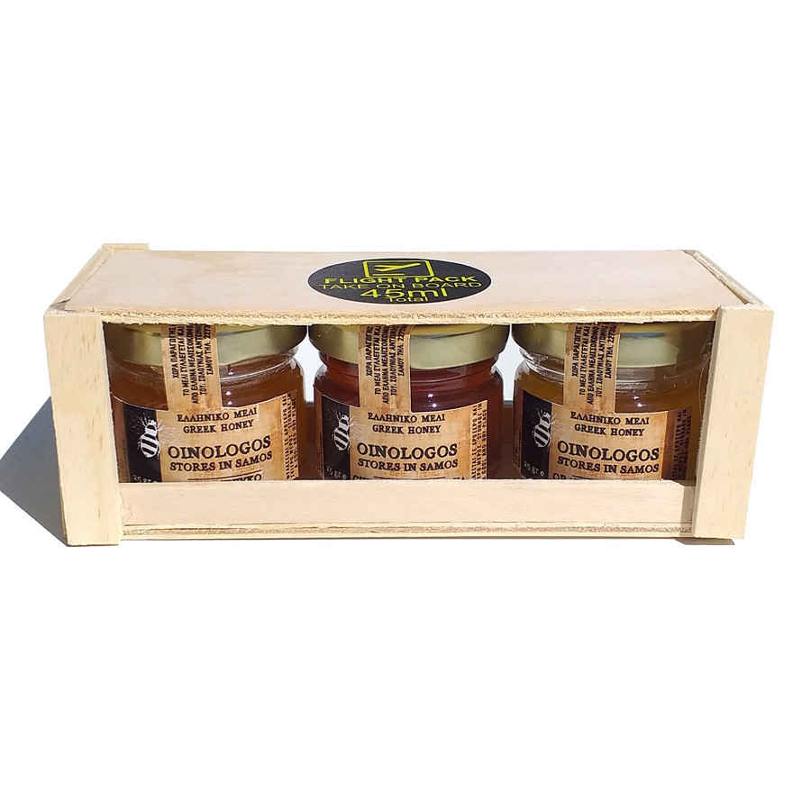 Gift Set Greek Honey 3x25 gr. Variety of honey products. Dimensions - Length 14 cm/ Width 6 cm/ Height 5 cm. Flight Pack.