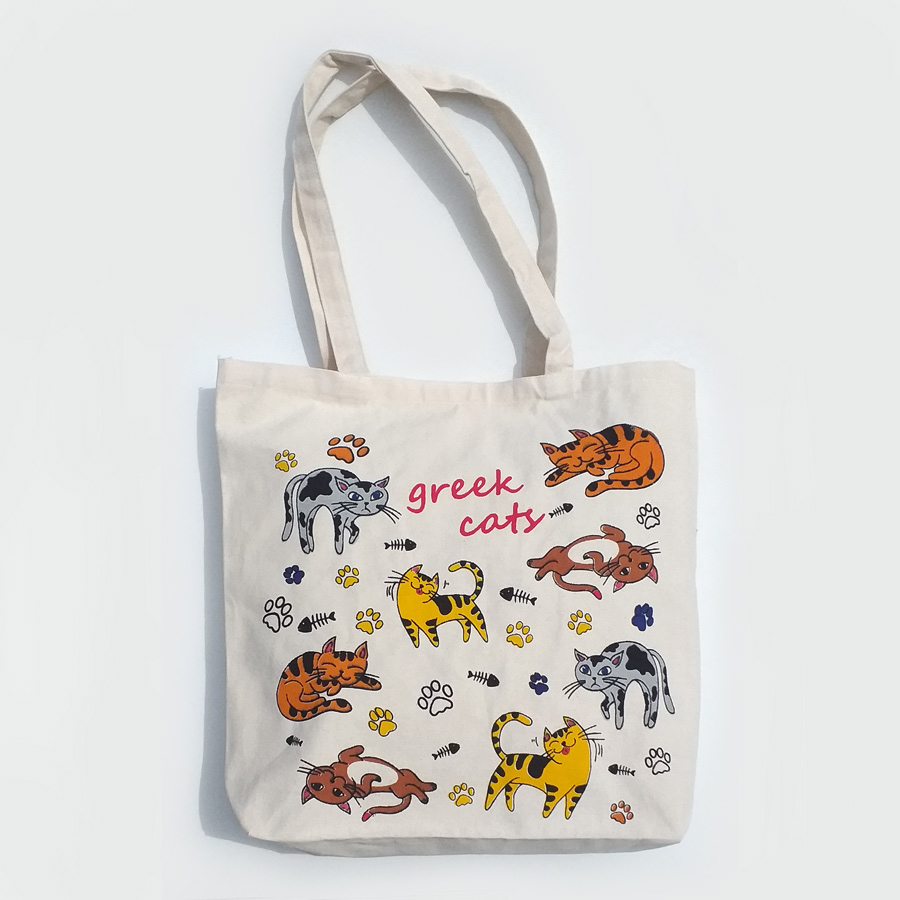 Canvas bag. Ideal for walking, shoping, sports, sea. Dimensions 43x40 cm. Greek cats printed theme.