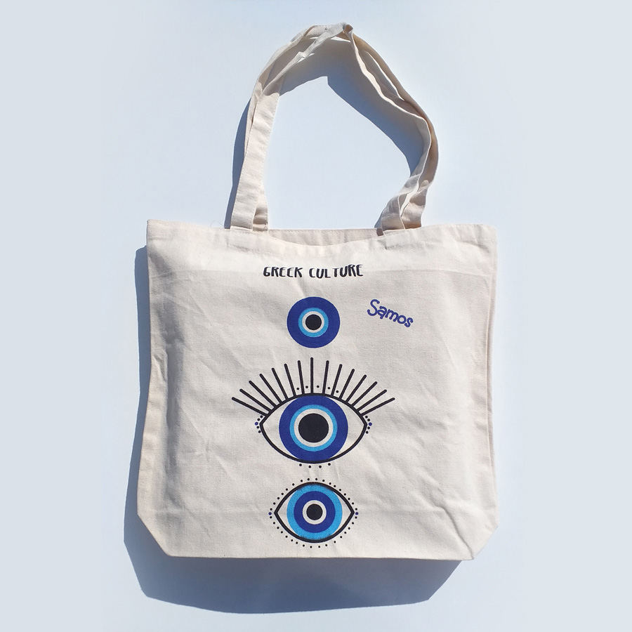 Canvas bag. Ideal for walking, shoping, sports, sea. Dimensions 43x40 cm. Evil Eye printed theme.