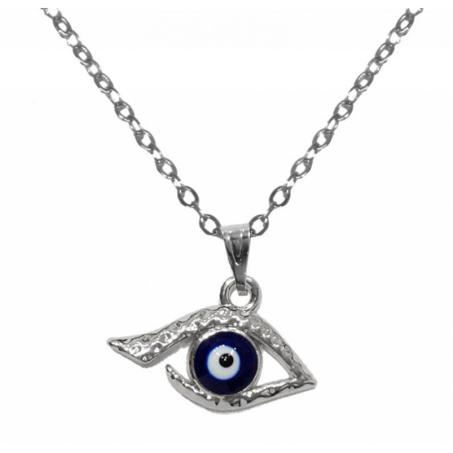 Necklace with metal chain and eye. The eye symbol is used as a talisman in greek culture. The chain has a clasp and a perimeter of 40 cm. The materials used for construction are safe and hypoallergenic. The metal elements do not oxidize.