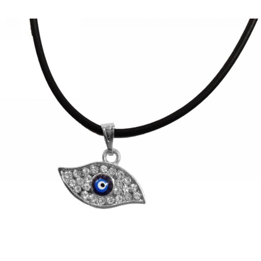 Necklace with rubber collar and eye. The eye symbol is used as a talisman in greek culture. The collar has a clasp and a perimeter of 40 cm. The materials used for construction are safe and hypoallergenic. The metal elements do not oxidize.