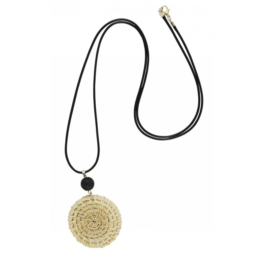 Necklace with cord, wooden element and wicker. The materials used for construction are safe and hypoallergenic. The metal elements do not oxidize.