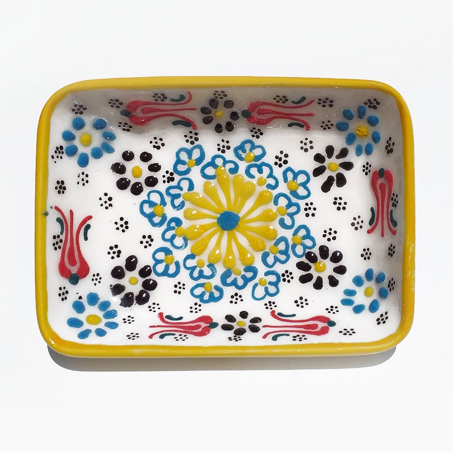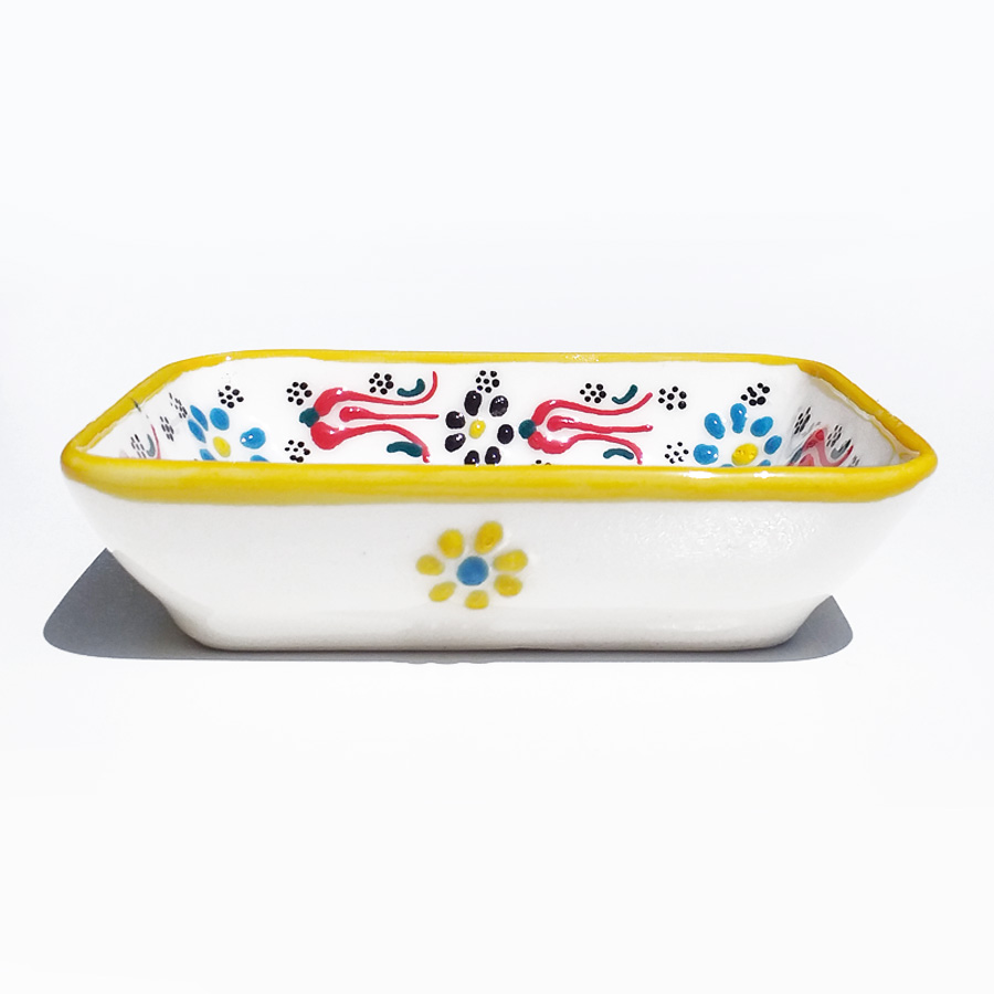 Handmade ceramic rectangular bowl, food and liquid safe. In order to maintain the quality and the colours of the item do not put it in the dishwasher. Dimensions 10x8 cm. Due to the unicity of each item it's possible to find some variations between the photo and the object you'll receive.