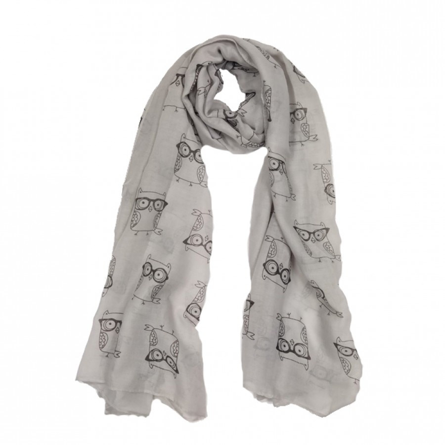 Elegant grey scarf with owl print ● Rectangular ● Length 180cm, width 70cm ● 100% viscose ● Season: Spring, Autumn ● Occasion : Day to Night